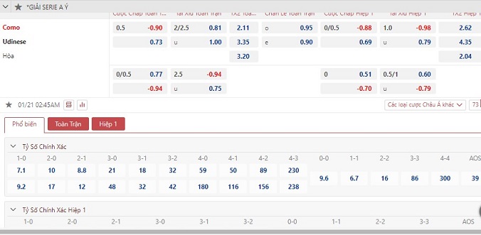 Nhìn lại từ quá khứ, Como chưa một lần khiến Udinese phải lo lắng khi thua cả 3 trận, trong đó thua 0-1 ở lượt đi đồng thời thua kèo +1/2. Ở trận đấu này khá bất ngờ khi kèo đảo chiều, -1/2 dành cho tân binh Serie A nhưng chiến thắng là điều không dễ có được.