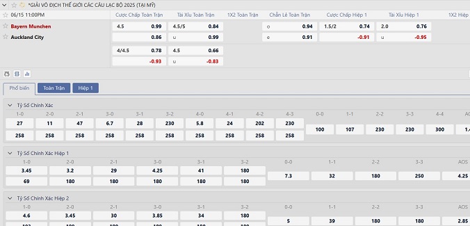 Tỷ lệ kèo Bayern vs Auckland hôm nay, 23h00 ngày 15/6